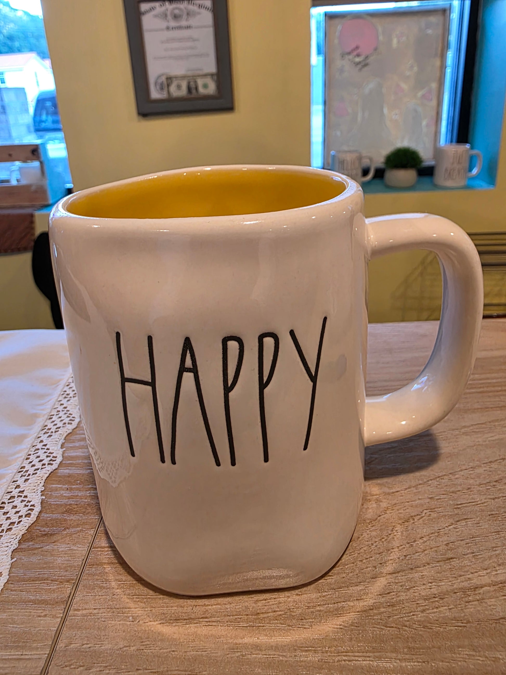 Indulge in a luxurious sipping experience with the Rae Dunn "Happy" Mug. Made by the renowned Rae Dunn brand, this mug features a unique design with the word "Happy" beautifully inscribed on it. Crafted from high-quality materials, this mug is both functional and stylish, making it the perfect addition to your kitchenware collection. Start your mornings on a positive note with this exclusive mug and elevate your tea or coffee drinking experience.