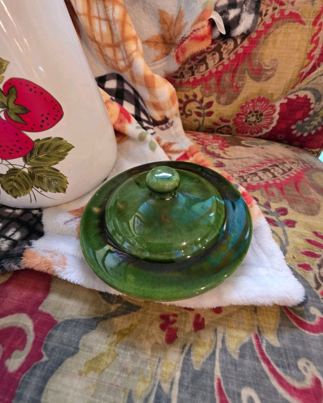 The VTG McCoy USA Strawberry Fields Country L Crock Cookie Jar Utensil Holder with Lid is a vintage piece of pottery handmade in the United States. This large round crock features a glossy finish and a colorful strawberry pattern, perfect for adding a touch of Mid-Century Modern style to your kitchen. It has one compartment, a handle lid, and is easy to clean, making it both decorative and practical for storing utensils or snacks. The McCoy brand and the specific "Strawberry Fields" product line add to the charm and authenticity of this unique piece. There is a small crack as shown in the pictures.